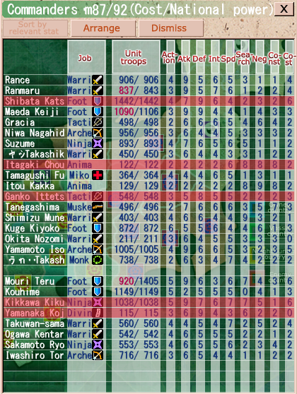 who do crazy damage but only have 2 shots, ninjas who can sometimes insta-kill enemies, archers who use range attacks from the back row, medics who heal,  Animals who you never actually use in combat, diviners who are amazing, and a few other types. To win a fight you can either kill all of the enemy units or just do enough damage to tip the scale up top in your favor. Each of these units have different stats and increasing your affection lets them level up which can increase their stats or get them unique abilities. Defeating an enemy sometimes lets you capture them. After this you can use units with high negotiating stats to convince them to join you. If your units get defeated they’ll often just get KO’d for the fight but sometimes they’ll straight up die. This includes interesting side characters or even the player character. Every once in a while I would win a fight only to get a game over because the RNG gods decided I died.