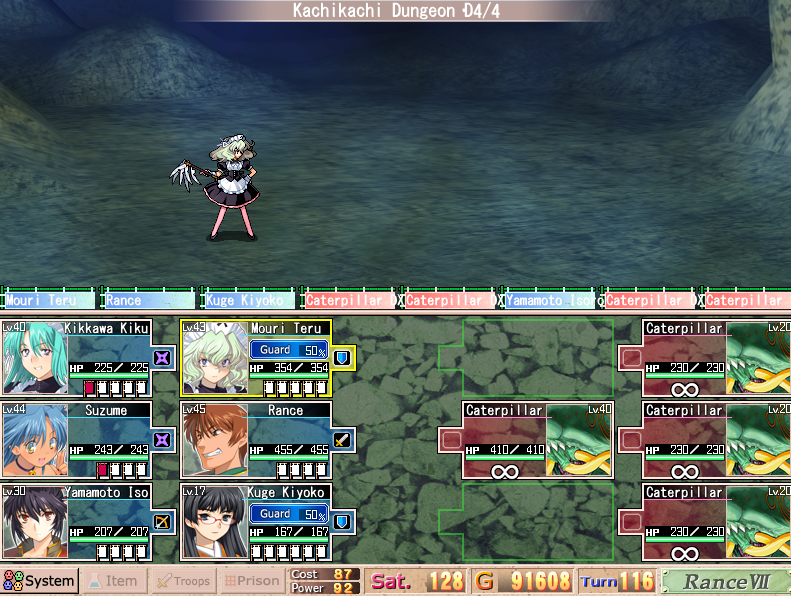 As for the story, lets get this out of the way; Rance is an asshole. Seriously. The game does not try to make it’s main character likable in any way. Honestly, this threw me off for a while. I thought it was going to pull a TLS and surprise me with a different real main character but NOPE! I mean, Rance is the one the series is named after. He’s the “irresponsible person put in a position of power” trope personified. When he’s not raping random women he’s beating his slave. After a while I got used to this and started to go “Oh you” a lot more as opposed to trying to find someone else to like. The cast of characters is actually pretty decent and interesting. Of course you have your government mandated shy and insecure little girl and your tough as nails doesn’t talk much warrior women but you also have an engineer made out of cubes, pedophile samurai and not one but 3 battle maids.