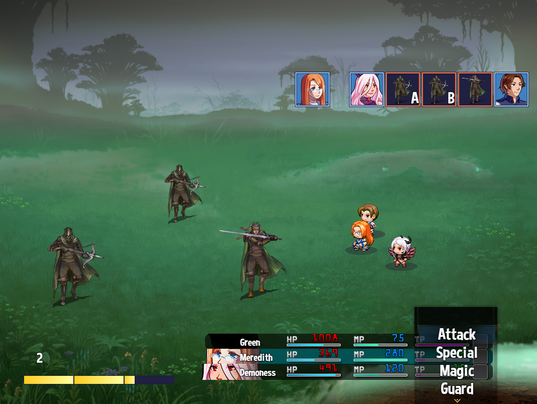 health bars have a black gradient towards the end that makes it hard to tell at a glance what percentage of health I actually have left, the main character doesn’t have a face sprite for battles, instead of having a portrait for the menu like all of the other characters temporary party members