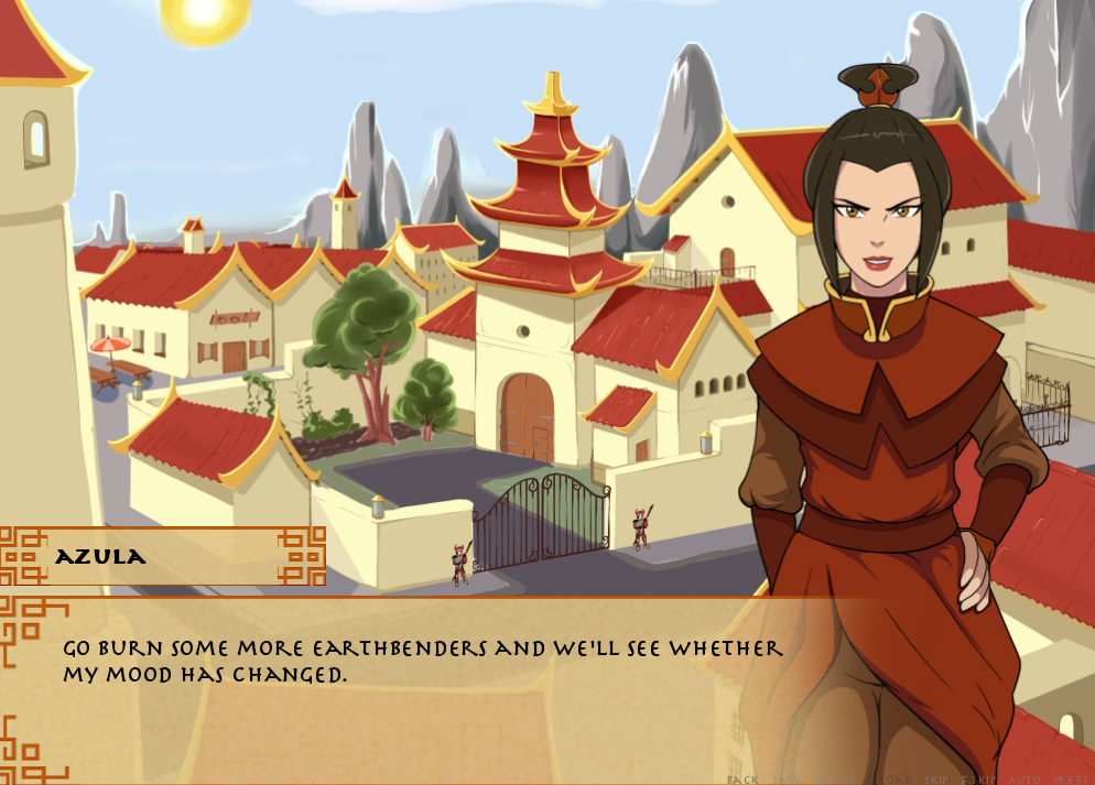 Anyways. There are multiple story paths to go through for the fire book but in the one I went with I started as a slave to Azula and eventually work my way up and become her master. Standard stuff. I have a shop where I buy items to use to increase my relationship with her and other characters, I have different jobs to do to make money, and I have a small map to explore.