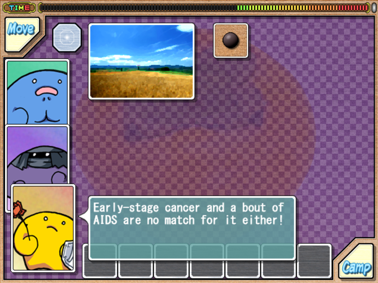 Sometimes you’ll find items, most of the time your inventory will be full of junk that you’re too scared to throw out. Really the biggest problem with this game is the single unavoidable autosave slot that you get. Every time you land on an event your game will save. This can easily fuck you over. Example: At one point in the game you end up in a desert. Eventually you find a vending machine. One of the characters straight up says it’s probably a trap so I avoid it. Then half an hour later I land on an event and the game autosaves. The event consisted of my dying of thirst in the desert because I didn’t get a drink from the vending machine. I had to restart the entire game. Fuck this game.