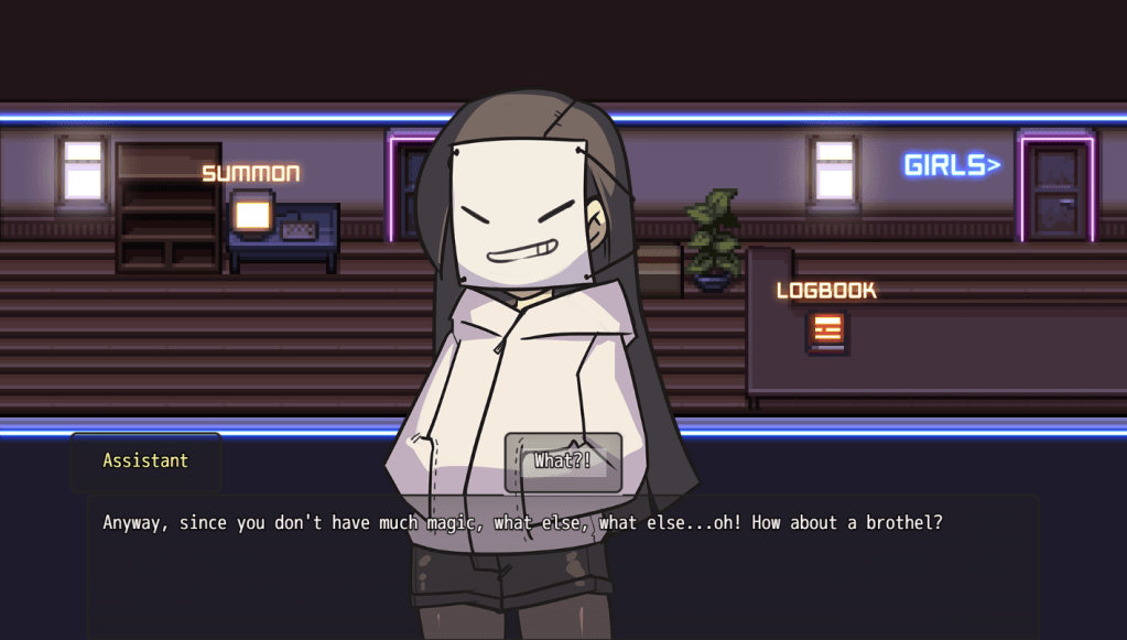 Yeah. It looks just as bad when it’s moving. So…apparently the dev thought “You know what our VN RPG needs? The world’s worst minigame” and then decided to have the player control a jpeg of Satan and have you dodge waves of arrows. Not only does this look awful but it makes 0 sense. Admittedly, I’ve only seen the protagonist from the waist down but he definitely isn’t a big red devil. And why are the arrows like that? There’s only 2 elves. How are they shooting 4 arrows at once? I mean, it only lasts for 20 seconds and it isn’t that hard. The only reason I failed it once was due to shock and a mad scramble to get a screenshot. I know it’s a demo and this probably won’t be what it looks like in the final version but it’s just so jarring. It’s like watching a play and all of a sudden, while in character, an actor jumps off stage and makes you play Tic-tac-toe with them. The weirdest thing is that the game has other minigames that look infinitely better than this.