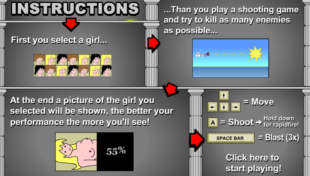 Gameplay is basically the Ikaruga Ikaruga wishes it could be. Large MSpaint sprites fly at you from across the screen that all instantly die to your storm of projectiles. Then you fight a boss…Then you fight him 2 more times. Each time him boasting that this is his final appearance. And what do you get from this? How’s the porn?