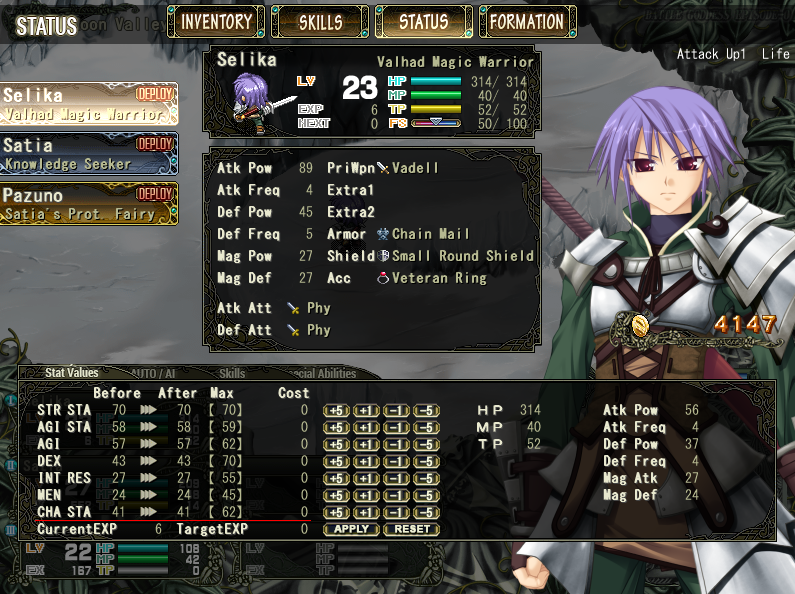 Killing monsters nets your party EXP which you can spend to level up Selika’s different stats. Your other party members get it too but they just get periodic level ups with no micromanagement required. Unfortunately you can’t pump your stats however you like. Each stat has an upper limit determined by your other stats. No matter how busted and lopsided you actually want to make your stats it will always stay pretty balanced. I can understand why this is done (Hint: End users are stupid) but it would be nice to be able to make Selika into a OP lightning mage if I wanted to.