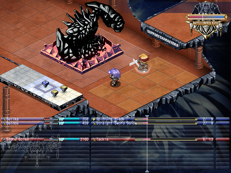 Now, how does it play? Well it’s like if you took the overworld system from Alchemy Meister (minus the crafting), the grid based combat from Bunny Black, and the real time/ turn based combat system from Grandia. Let me explain that in more detail. In your overworld you have your map. You have dungeons you can check out and a couple towns to visit. The towns have stores that sell mostly consumable items with the addition of a couple lame weapons. The starting town has a church that can sell healing items and remove curses and an arena where you can do fights for money. So far it’s pretty similar to Alchemy Meister. This game, however, does not have any form of crafting or shop running mechanics which makes sense seeing as it’s an earlier title.